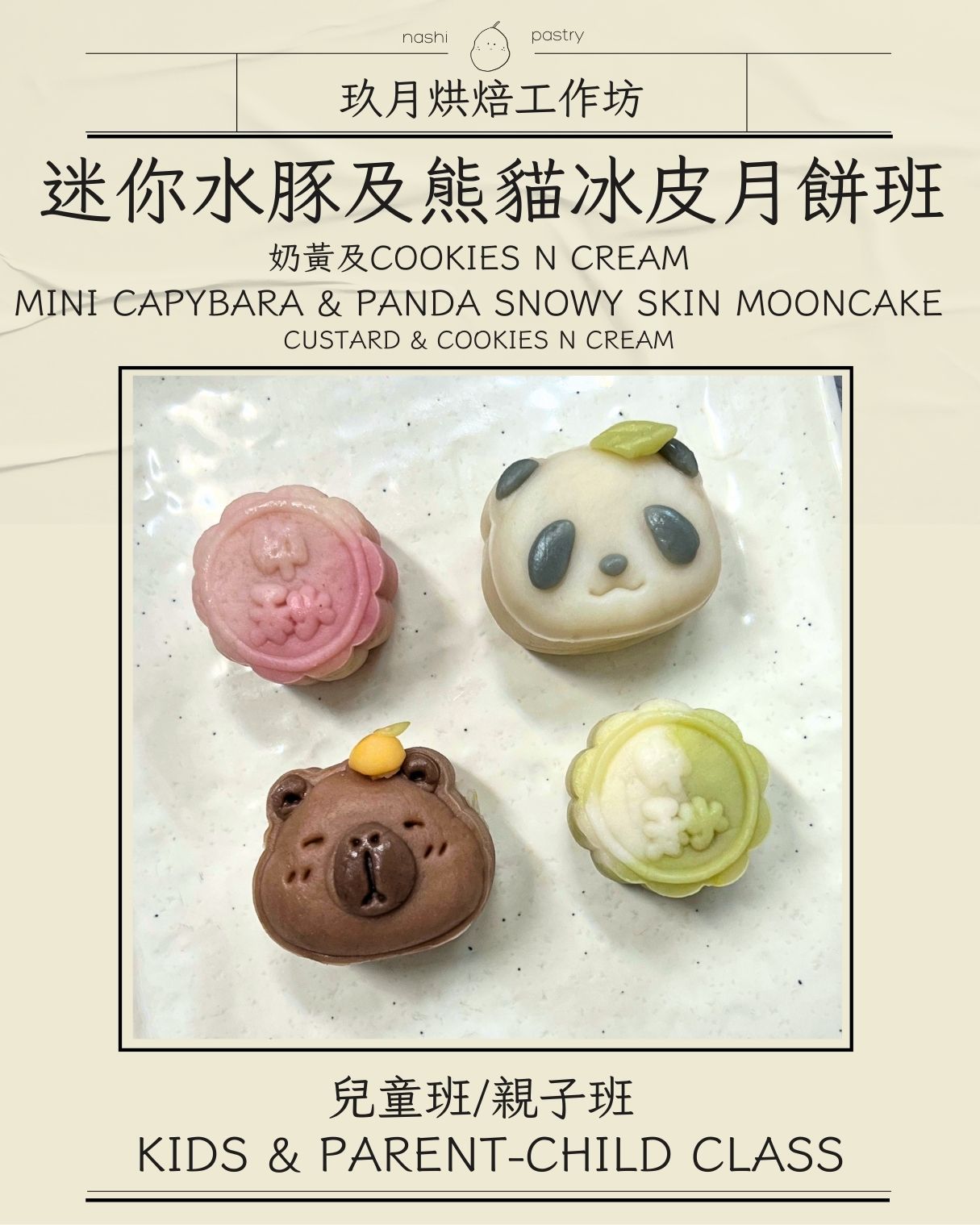 迷你水豚及熊貓冰皮月餅 (兒童班) Mini Capybara & Panda Snowy Skin Mooncake Course (Baking Class for Kids)